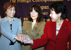 所要のため半時間ほど遅れてヘッドテーブルに着いた佐藤ゆかりさんは昼食もろくに食べないまま、小型のノートのメモを片手に聴衆に向かった。先行の二人がしっかり原稿を用意して演説調で講演したのに比べて、普段の会話と同じ口語体の話しぶりであった。 三位一体の改革、なかでも地方行政の改革と経済活性化、日本のODAを利用しての世界の貧富格差の是正など大問題をソフトな口調に包んでしっかり伝えた。 ところがソフトな口調と反対に切り開いた経歴はかなりハードだ。佐藤さんは上智大学入学以来、政治家を目指し、コロンビア大学を経てニューヨーク大学院で博士号をとるまで、パリ大学、ジュネーブ大学にも短期留学してアジアの開発経済と政治学をなんと14年間も学んだ。外資系証券金融会社であるクレディ・スイス・ファースト・ボストンの経済部長の職にあったときもずっと政治家志望は変わらなかったという。 私たち三人がジェンダー バッシングを許さないこの会見の前日、国連人口基金は世界人口白書を発表した。それによると世界で読み書きできない人の3人に2人は女性。難民の八割は女性と子どもであり、他の調査でも貧困状態にある人々の七割は女性という。この悲惨な状態から逃れるカギは「ジェンダー イコーリティー」(社会的文化的に形成された男女性別の平等)という。 ジェンダーという言葉は国際機関で使われだし、1995年北京女性会議以来、日本でも国や地方の行政機関、大学、女性センターなどで使われている。 1996年には男女共同参画社会基本法が制定され、その5年ごとに見直される行動計画は来年が改定される予定になっている。ところが「過激な性教育・ジェンダーフリー教育実態調査プロジェクトチーム」(安倍晋三座長)はジェンダーという言葉を削除するように求めてきた。 ジャーナリストも政治家も言葉の使い方には神経を使うプロである。筆者はそこで3人に「ジェンダー」という言葉を使うかどうか、基本法を読んだかどうか、ジェンダー・バッシングをどうすれば防げるのか質問した。