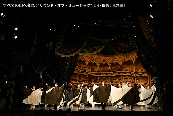 オーヴァチュアで幕が開いたその後、シンプルな二色の衣装で現れたキャストは「すべての山へ登れ」。家族ミュージカルで最も愛されている「サウンド・オブ・ミュージック」からの選曲だ。「ようこそ劇場へ」レオタード姿でのバー・レッスン。「アプローズ」に続いて法被姿の戦国時代の新聞屋「おれはひろめ屋」は“むかしむかしゾウがきた”のナンバーだ。