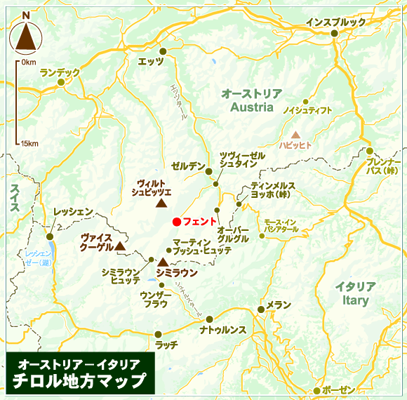 その道はフェントから先ず3時間ほどかけてマーティン・ブッシュ・ヒュッテ(Martin・Bush・Huette 2501m)、さらに3時間ほどでシミラウンヒュッテ(Similaunhuette 3019m)。ここから更に1時間半ほどでヒュッテよりも少し高い氷河の中(3210m)でエッチィは見つかったようです。周りは3千メートルを越える氷河ということで、準備不足を思い知らされ、この計画を諦めました。